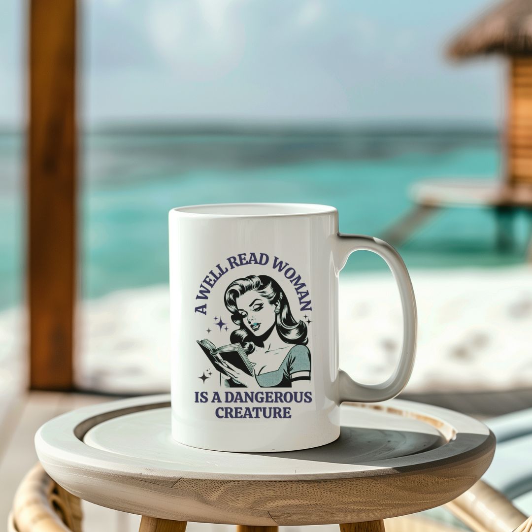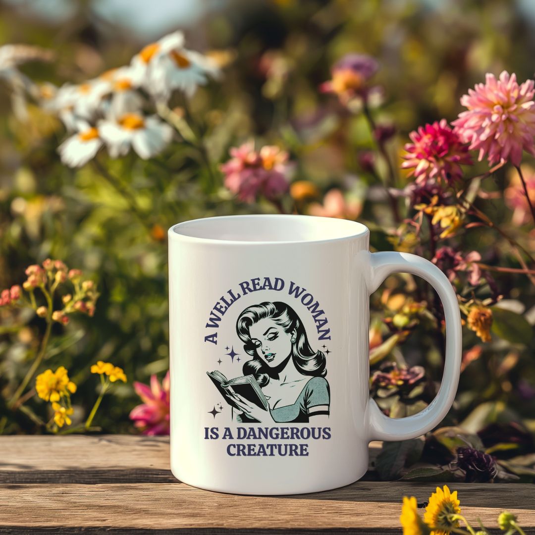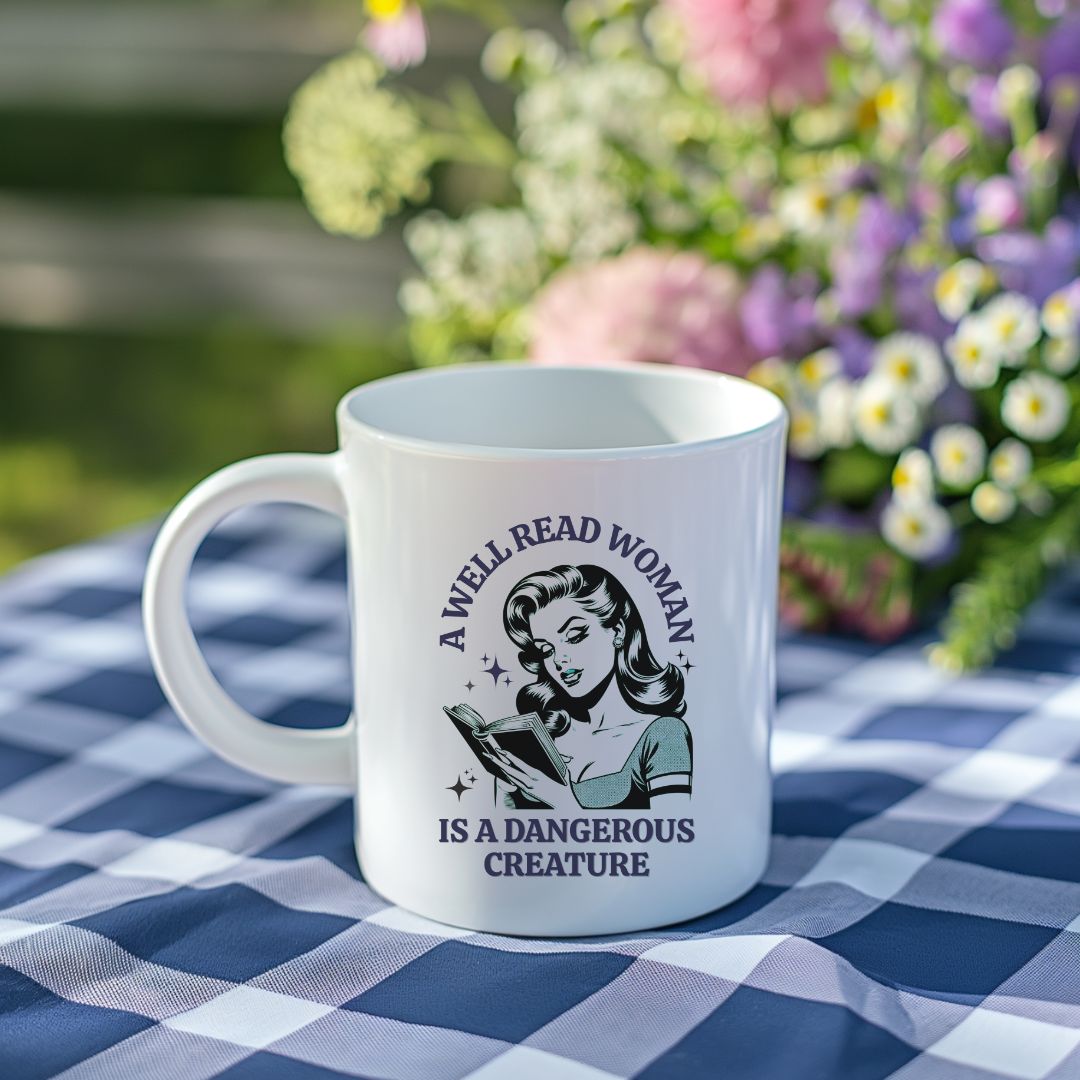 Start your morning with a strong cup of coffee and an even stronger message. This 15 oz. ceramic mug features a vintage-style illustration of a woman reading, paired with the striking phrase: “A Well Read Woman is a Dangerous Creature.” Whether you're fueling up for a busy day or settling in with your latest novel, it’s the perfect companion for thoughtful moments.