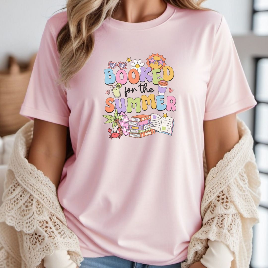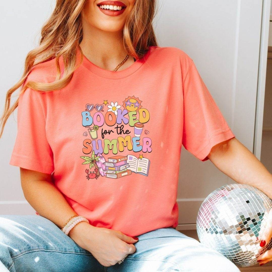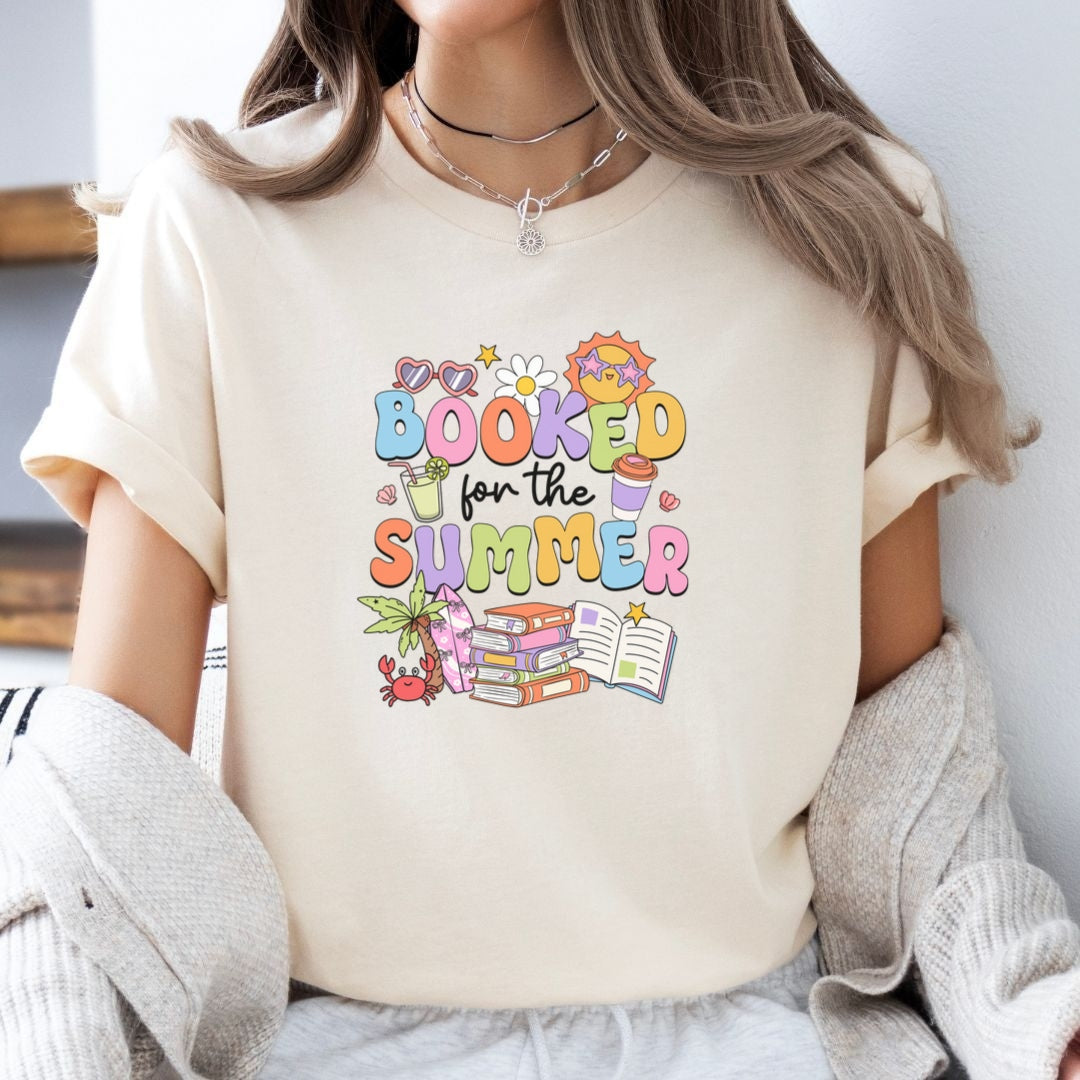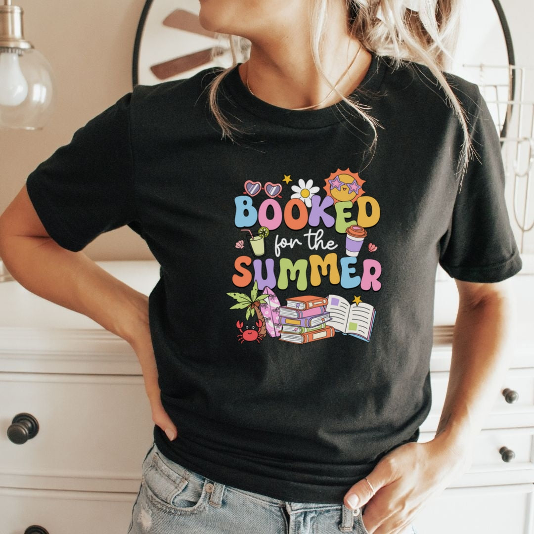 Say hello to your new favorite summer tee“Booked for the Summer.” (And our OFFICIAL Summer Reading Challenge Shirt!) This playful design features sun-soaked details like books, sunglasses, and a palm tree, capturing the ultimate warm-weather mood for book lovers. Whether you're poolside, beach-bound, or just dreaming of your next reading escape, this shirt is the perfect companion. Makes a fun gift for your book-obsessed bestie, too!