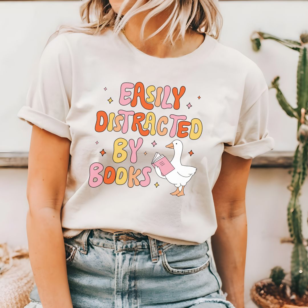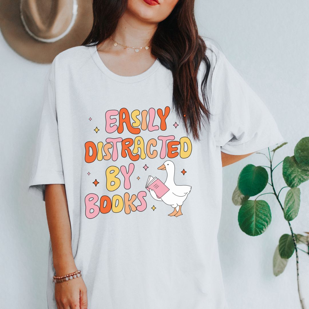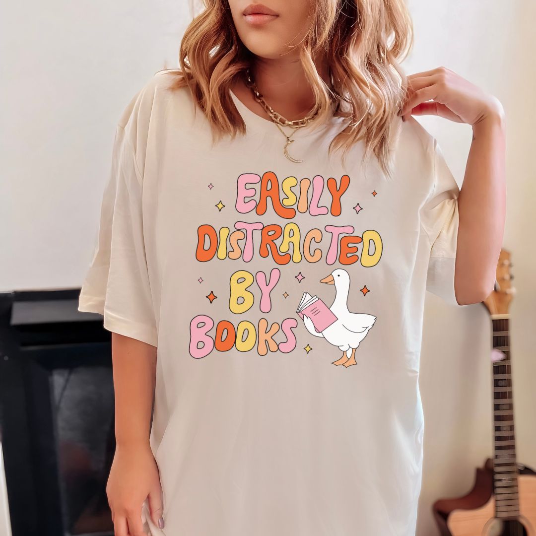 This playful tee features a cheeky goose and the phrase “Easily Distracted by Books." It's perfect for readers who proudly admit their TBR pile is the reason they miss appointments and sleep. Whether you're deep in a fantasy saga or just pretending to read while people-watching, this shirt brings humor and heart to your everyday bookish style.