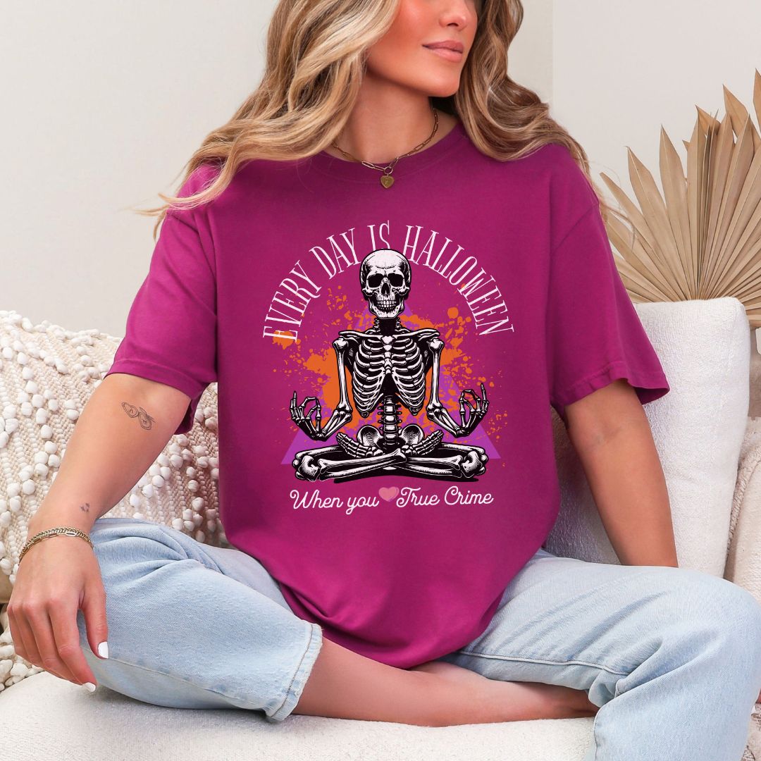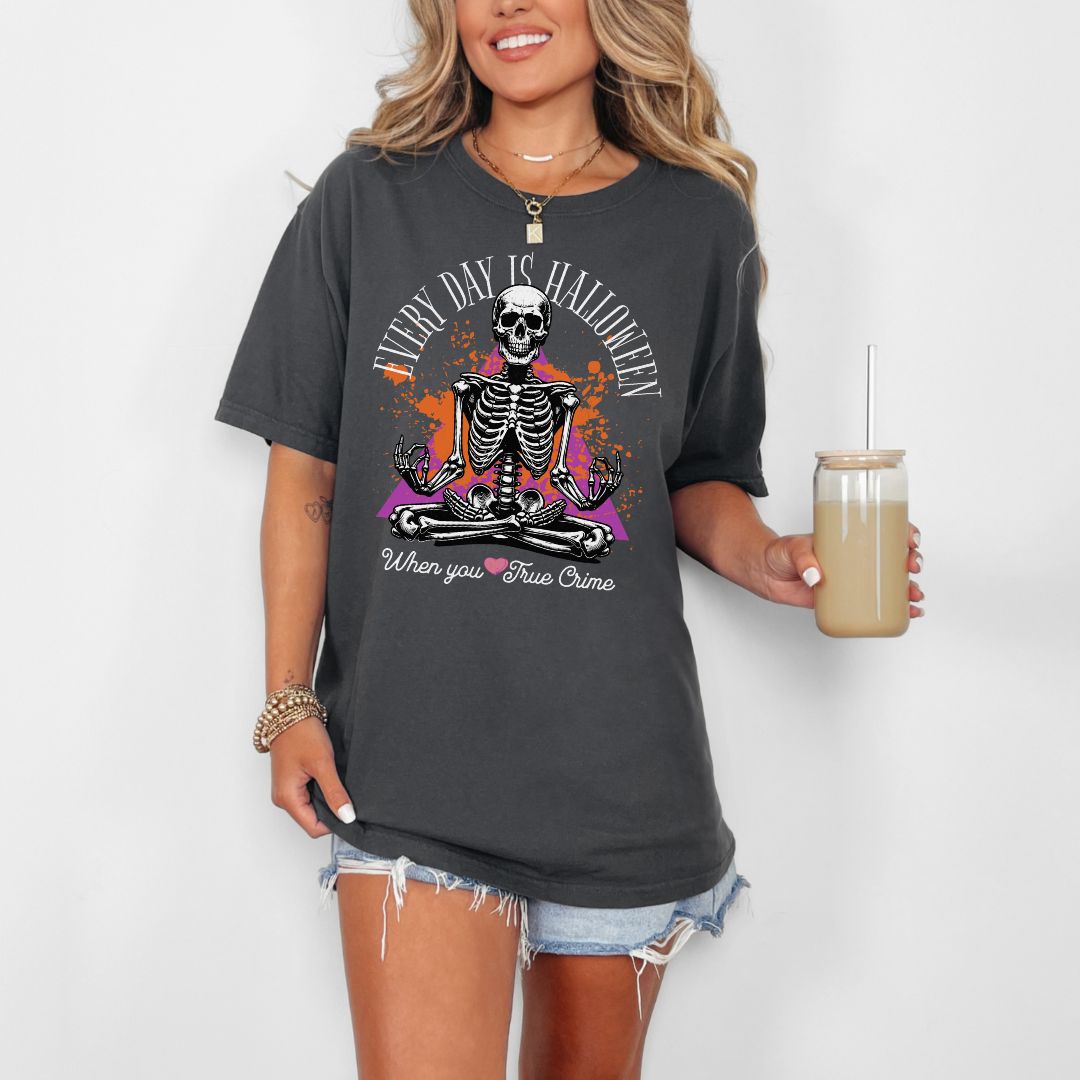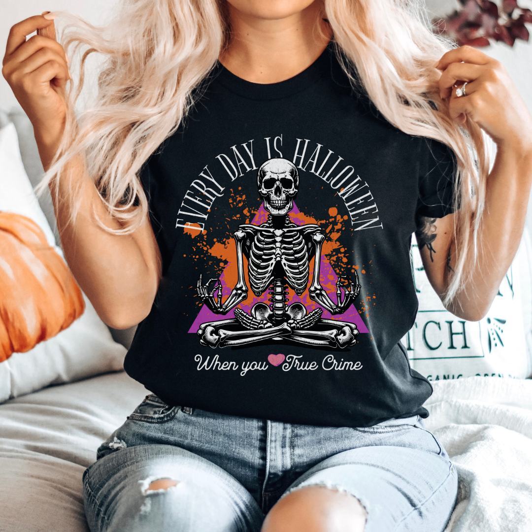 Darkness never takes a holiday. This Halloween-inspired tee declares what true crime fans already know—every day is Halloween when your nights are spent with cold cases, eerie documentaries, and bone-chilling podcasts.