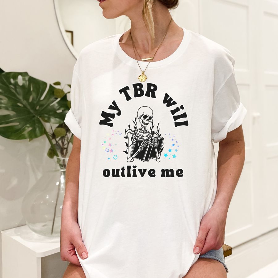 Are you constantly adding to your ever-growing "To Be Read" pile? Embrace your endless love for books with our charming and witty "My TBR Will Outlive Me" skeleton t-shirt. It's the perfect way to show off your literary passion and sense of humor!