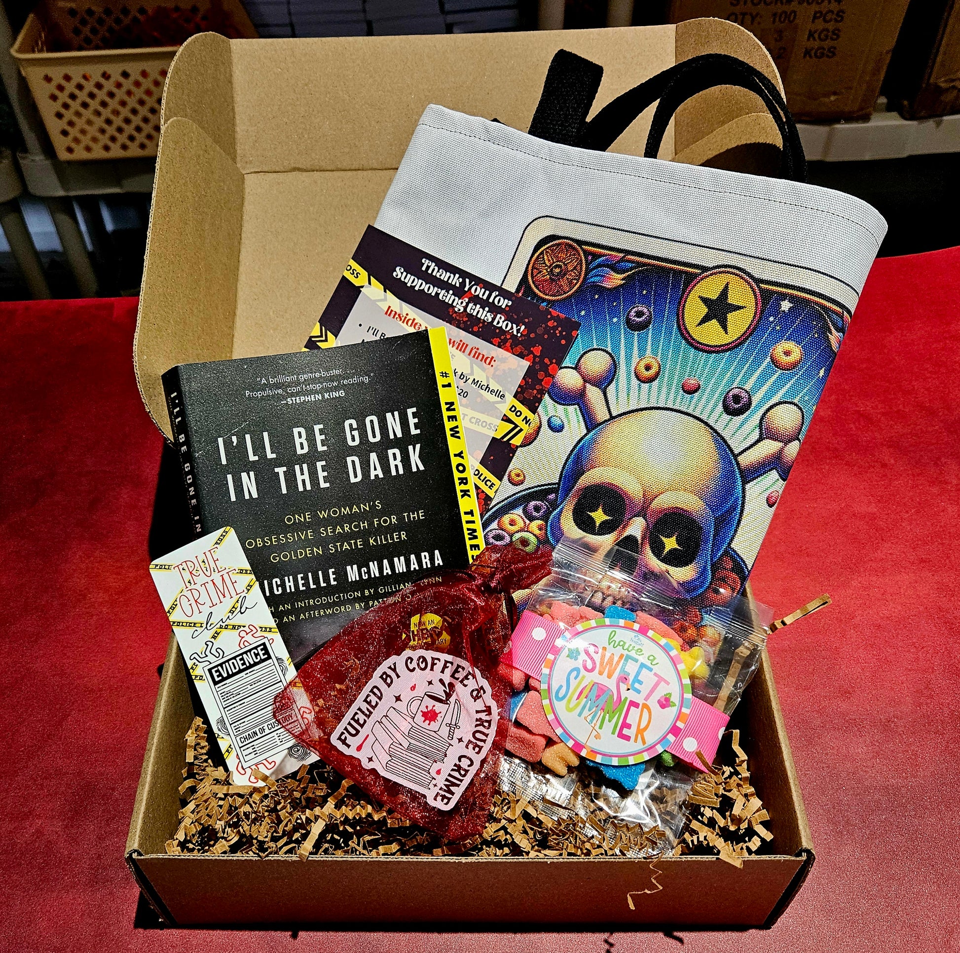 Inside this box is also a tote bag, an edible treat, as well as a crime scene bookmark and true crime themed sticker.