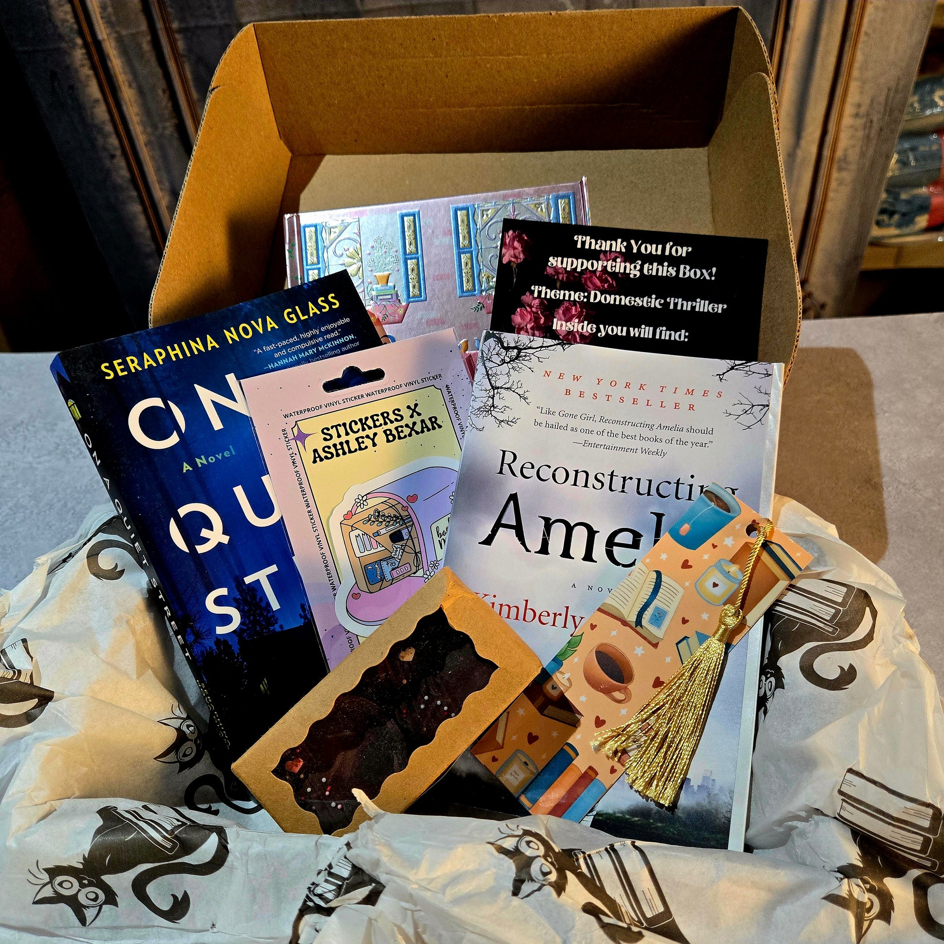 This box's theme is: Kidnapped! Our Mystery/Thriller Subscription Book Box is a quarterly subscription. Each box is curated specifically for those who love a suspenseful mystery. The boxes include at least two paperbacks from the mystery/thriller genre as well as 3-4 additional items including edible treats, reading accessories, puzzles, and bookish goodies.
