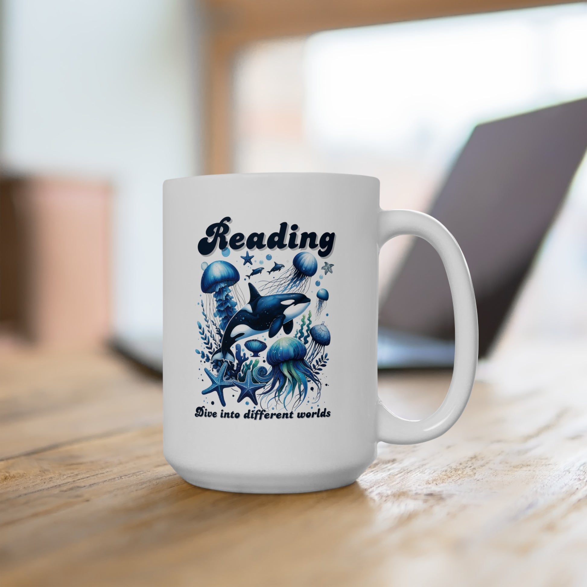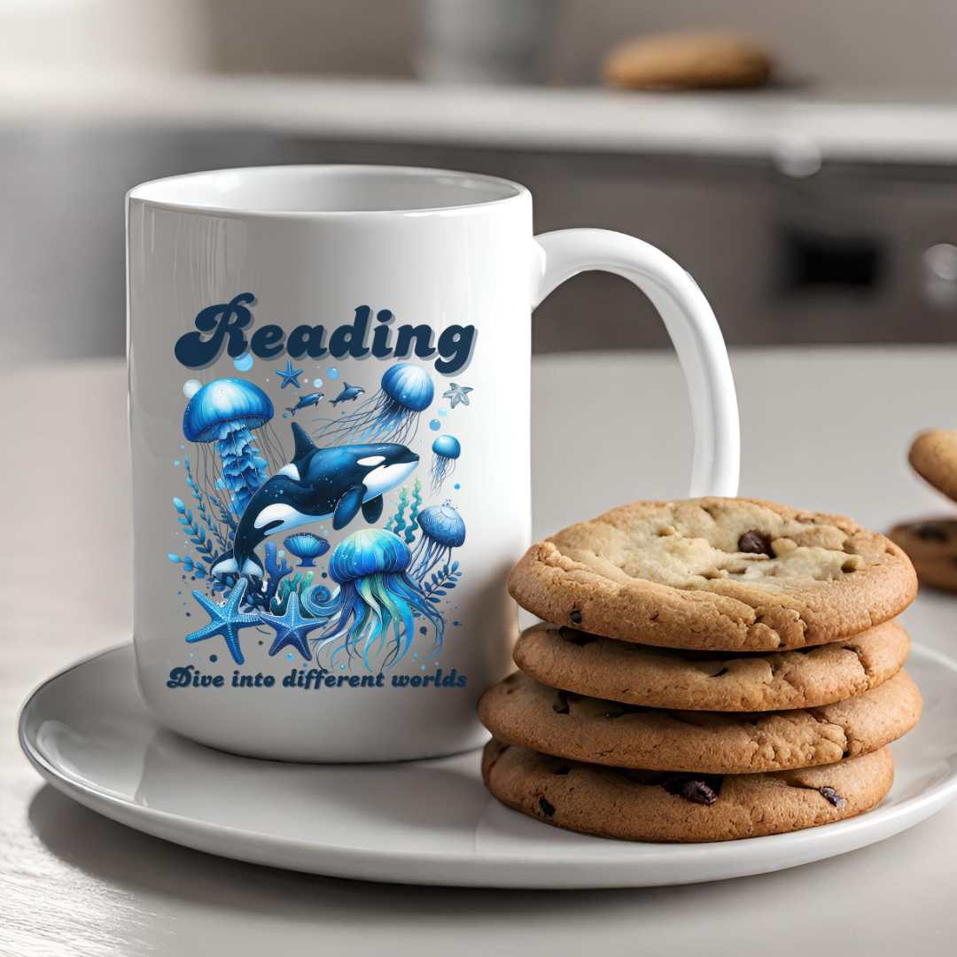 Get ready to love your new "Reading: Dive into different worlds" mug. This top combines the love of reading with the beauty of the ocean. This underwater seascape featuring whales, jellyfish, starfish and other sea life provides the perfect setting to describe another world, one just beyond our shores.